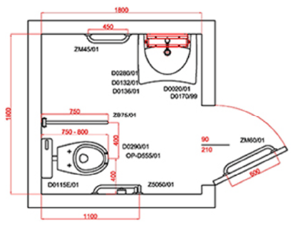 Aunque no existe una normativa real que defina con precisión las dimensiones mínimas de un cuarto de baño para discapacitados, las limitaciones de diseño dictan un tamaño mínimo de 180 cm x 180 cm.