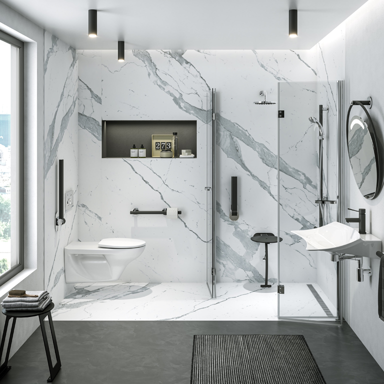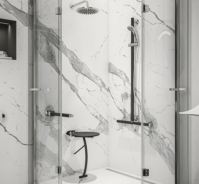 Compatible con ayudas de seguridad, incluso en los entornos más específicos y técnicamente organizados para el cuidado personal, como las residencias de ancianos y en instalaciones de alojamiento adecuadas para el turismo accesible, hoteles, y donde no se descuide el aspecto formal. La barra Shade se integra orgánicamente para convertirse en el elemento protagonista no invasivo.